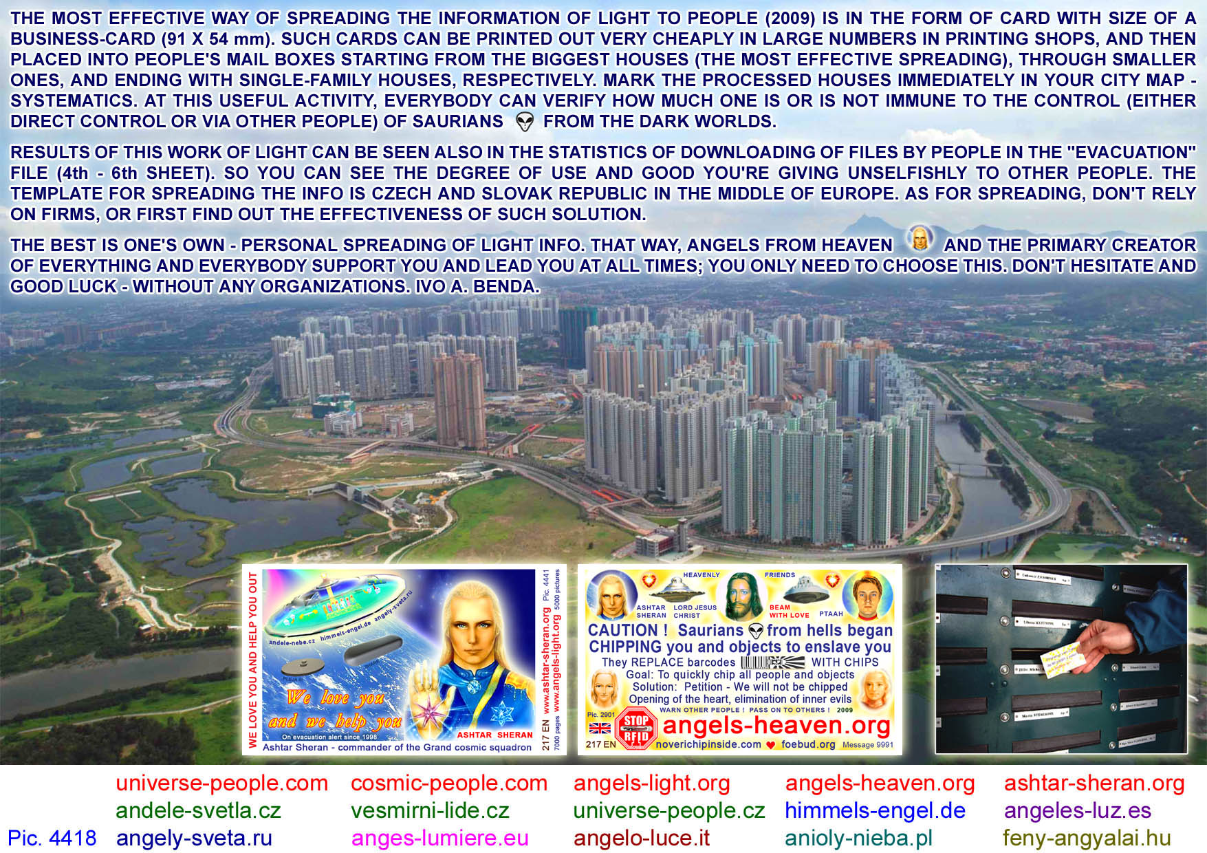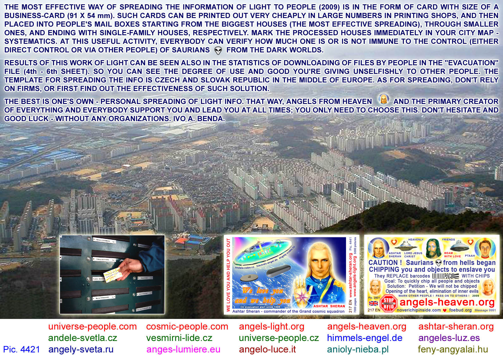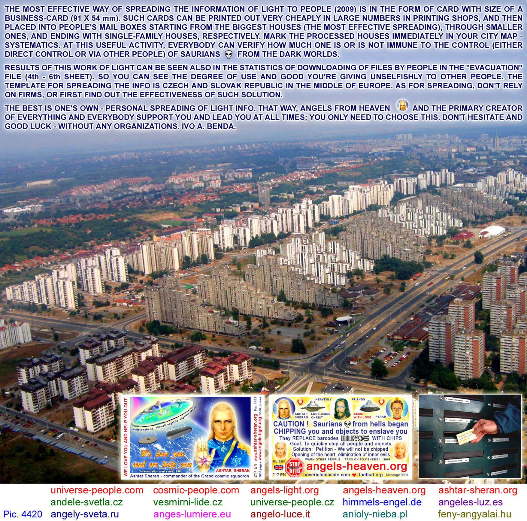 These are business card-sized pictures (shortly called "cards") which are especially suitable for personal spreading to mailboxes (letterboxes) at people's homes. You can have them printed in a printing agency. Millions of such cards have already been delivered by lightworkers in the countries of Central Europe, all this with love, for free and unselfishly. It is one of the most effective and systematic ways of giving the information of Light to people of Earth, so that people can wake up and understand what is happening to them and what is planned to happen to them soon. The cards can be used for many other positive purposes (spreading at public spaces, various actions/sessions/festivals (esoteric, U.F.O., ...), handing them to people passing by in the street, at the counter after being serviced, etc.) - it depends only on your willingness and creativity.