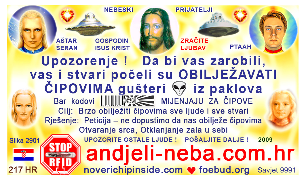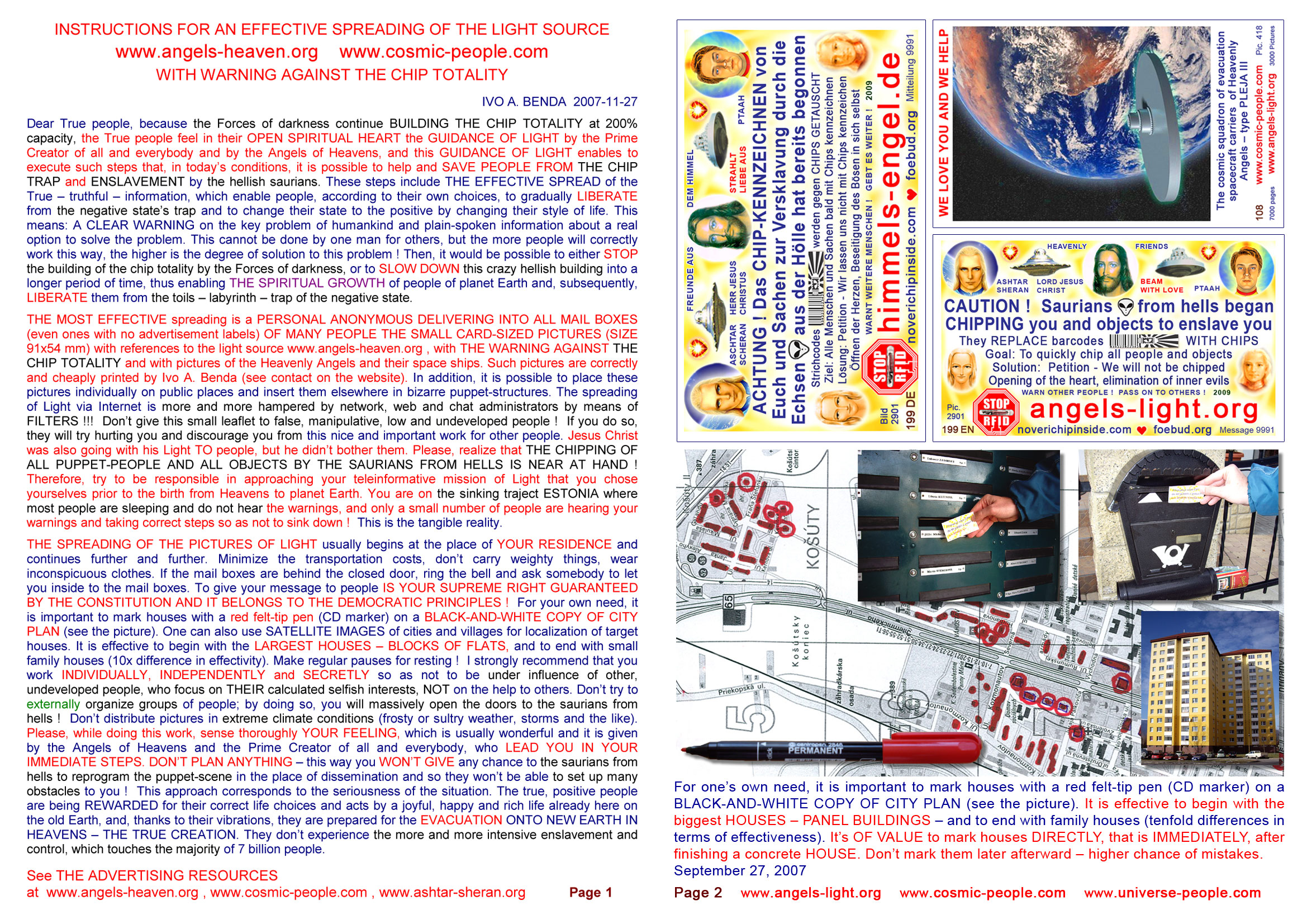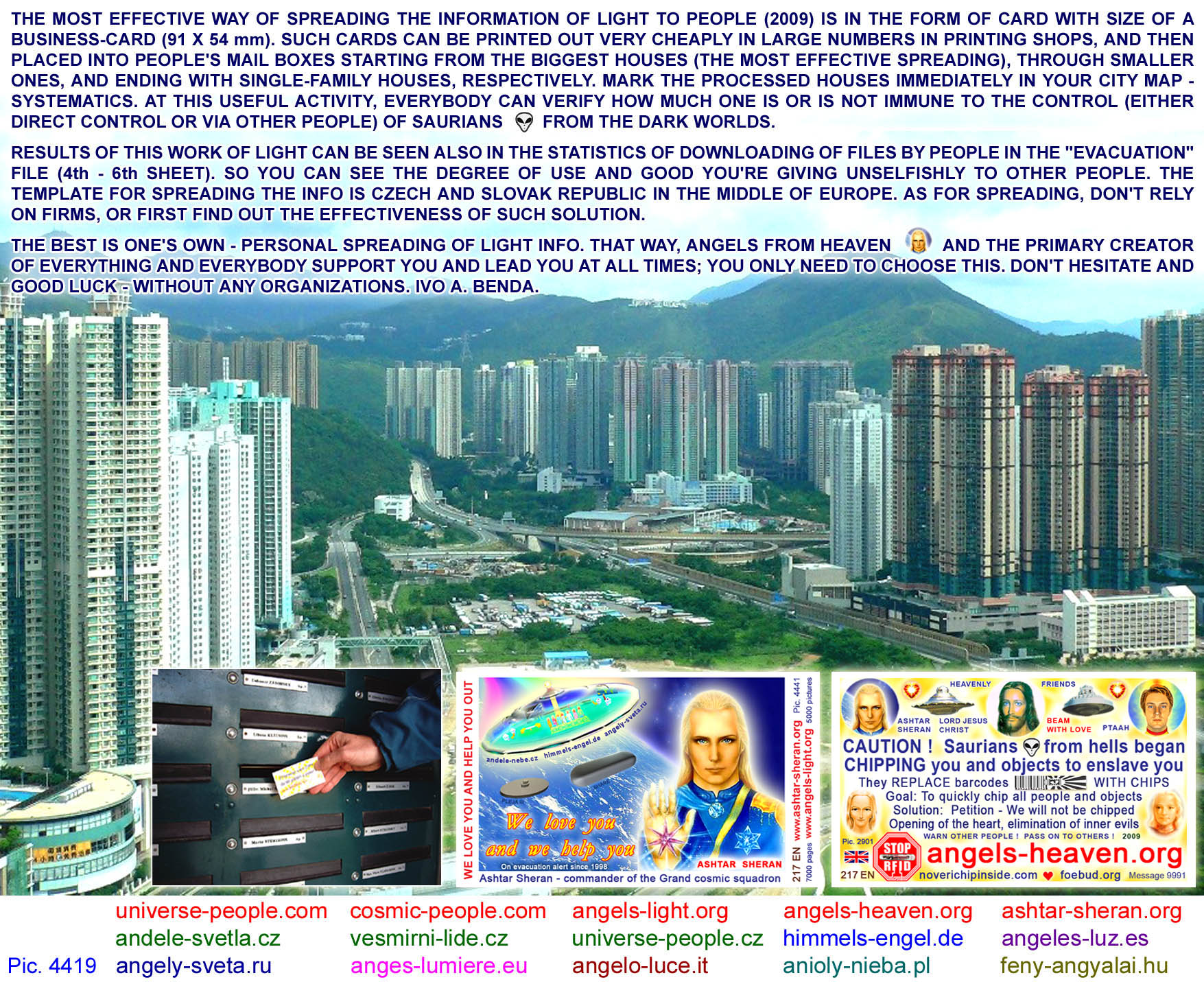 These are business card-sized pictures (shortly called "cards") which are especially suitable for personal spreading to mailboxes (letterboxes) at people's homes. You can have them printed in a printing agency. Millions of such cards have already been delivered by lightworkers in the countries of Central Europe, all this with love, for free and unselfishly. It is one of the most effective and systematic ways of giving the information of Light to people of Earth, so that people can wake up and understand what is happening to them and what is planned to happen to them soon. The cards can be used for many other positive purposes (spreading at public spaces, various actions/sessions/festivals (esoteric, U.F.O., ...), handing them to people passing by in the street, at the counter after being serviced, etc.) - it depends only on your willingness and creativity.