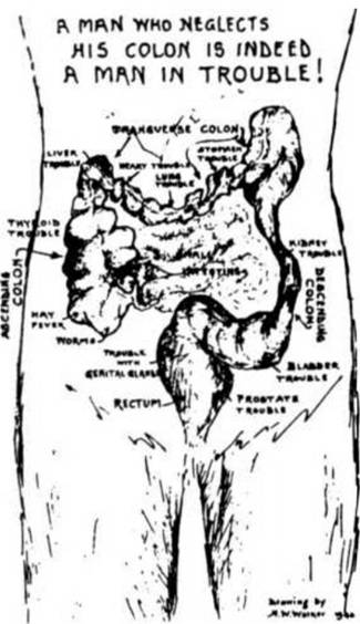 27.       The Appendix, that marvelous safety gland whose secretion prevents gas forming bacteria and other noxious germs from passing into the Small Intestines from the Colon. It has of late been allowed to function more normally since the education of the laity in the use of frequent enemas and skillful colonic irrigations.